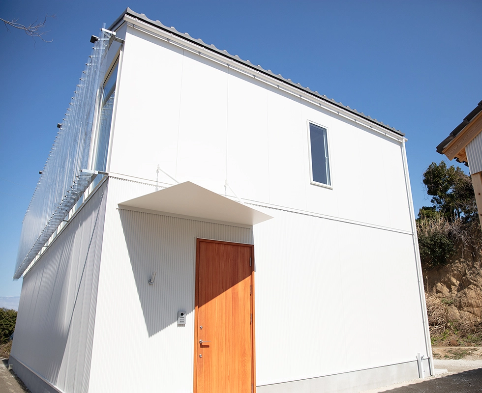 那須塩原の「牧歌的な」風景に計画のペットコテージ、つまりペットと泊まれる宿舎である。大屋根軒下の余白のような壁にはフラットウォールが選ばれているが、その壁に余白のように希薄な風合いをもたらすために、目地割や出隅、屋根と巾木との接合部には細心の注意が払われている。総じて牧歌的であることがとてもいい。