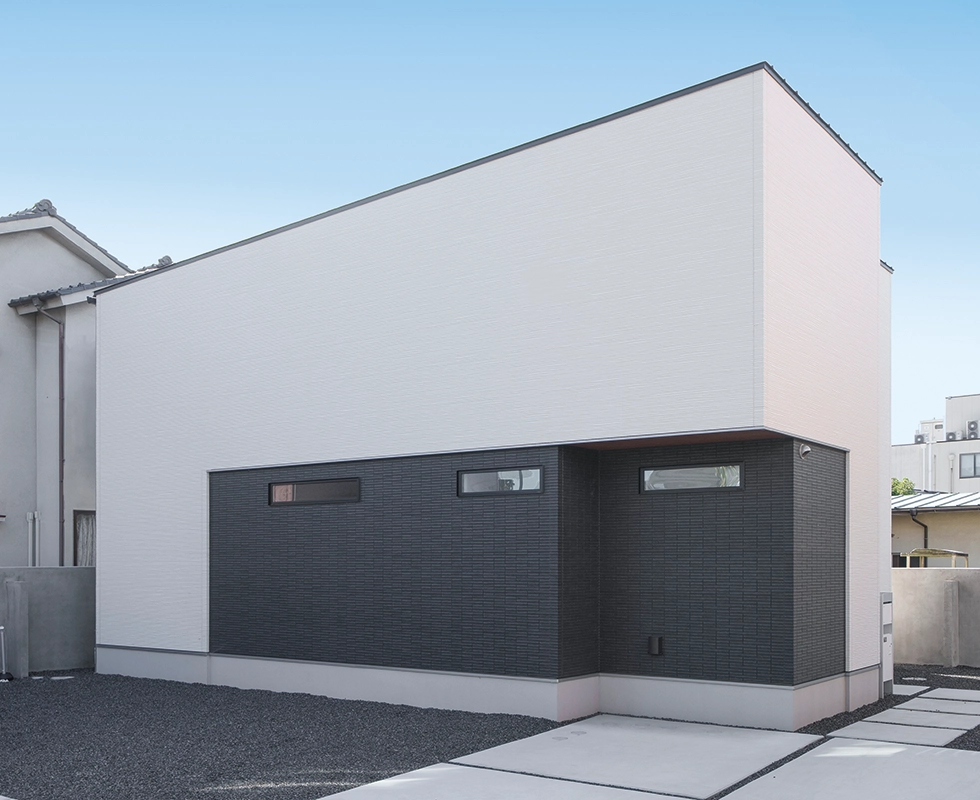 丹念なディテールの追求が豊かな全体像を生成する、建築アプローチのお手本のような住宅建築である。フラットな表面性を生かした壁の起伏、同色の雨樋、えぐられるような木質の軒、そのようなディテール集積がFu-geの製品特性を生かす好例といえよう。