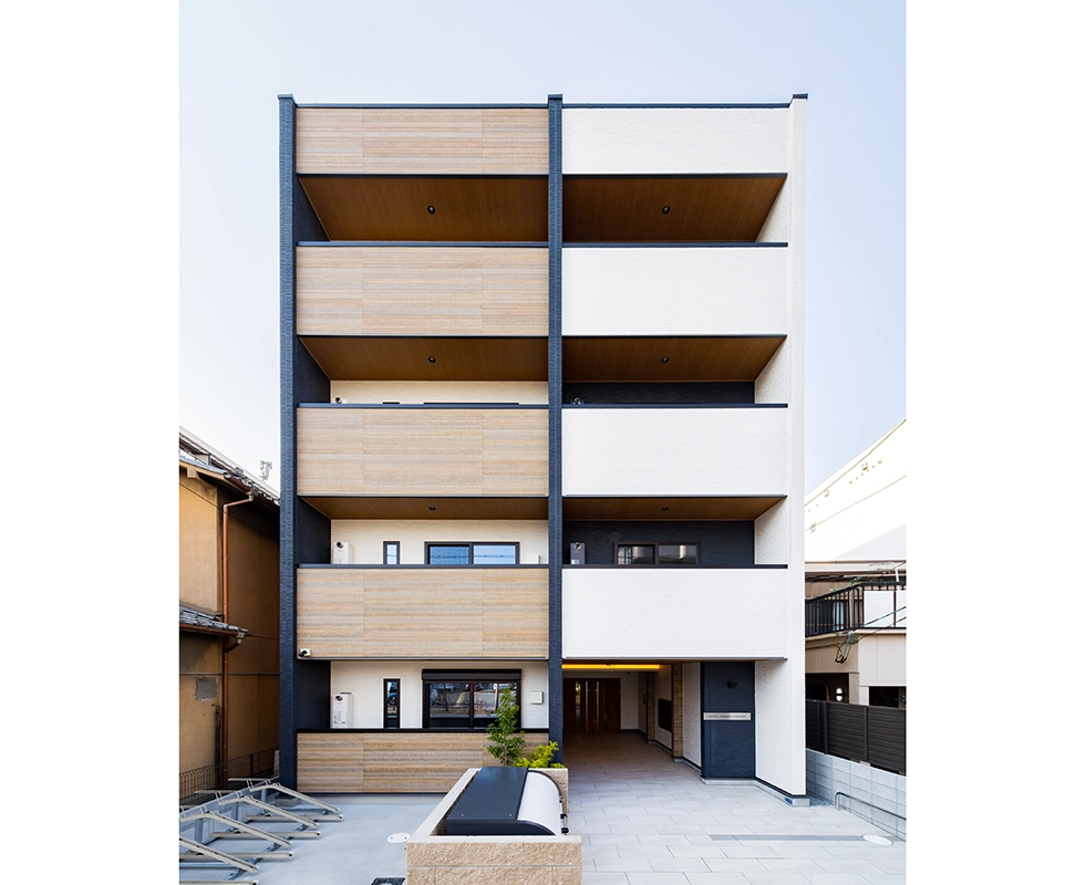 中層賃貸マンションでRCと木造(上層4層)のハイブリッド構造であり、耐火性能を求められるサイディングの採用としても興味深い案件である。バルコニーデザイン手法の工夫として、ヴィンテージウッドを使ったアトランダムグリッドデザインが動的な外観を生んでおり、街並みのサーフェイスのボトムアップに貢献している。