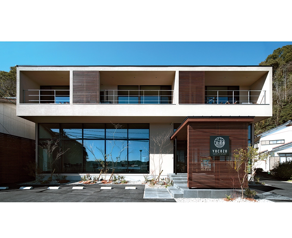 佐賀県唐津市の海辺に立地する小ぶりなホテルである。そのクオリティのほとんどが「海辺」にあるような、大変慎ましくシンプルな出で立ちのホテル、というところが好ましい。そのシンプルさを担うのが外壁のモエン大壁工法で、この製品の特質が十二分に生かされた秀作である。