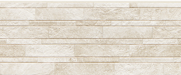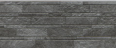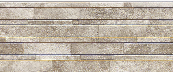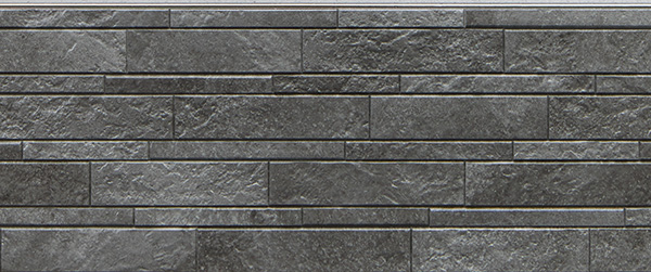 傾斜ピースを取り入れた大小の切石が水平方向に並ぶ、端正な積み石風の外壁。混在する複数のテクスチャーによる印影が表情を豊かにします。