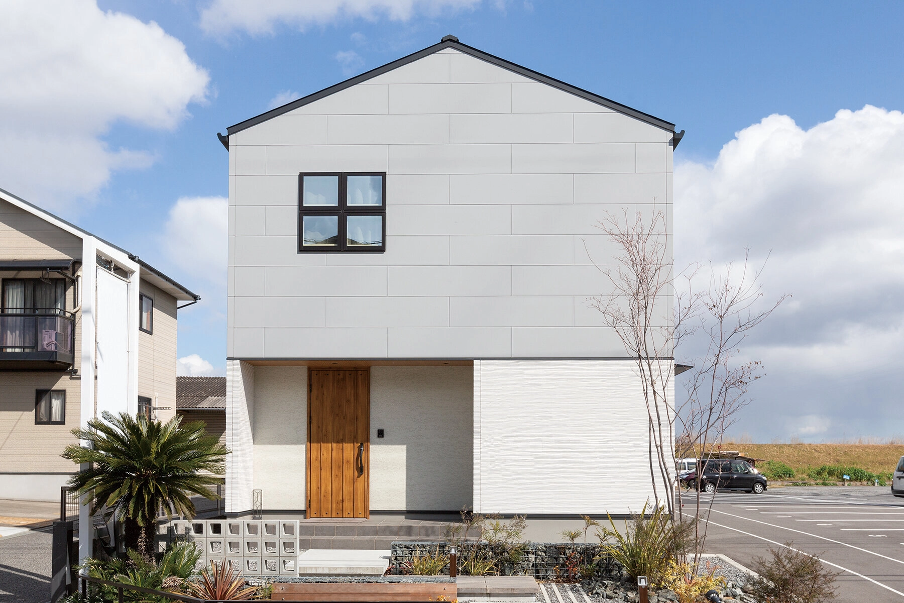 イルミオをウマ張りで用い、印象的な装いとした淡色のすっきり爽やかなコーディネートの中、サッシや破風、水切りを濃色としアウトラインを明確にしています。また、玄関ドアや軒天を木目とし、やわらかな印象も演出しています。