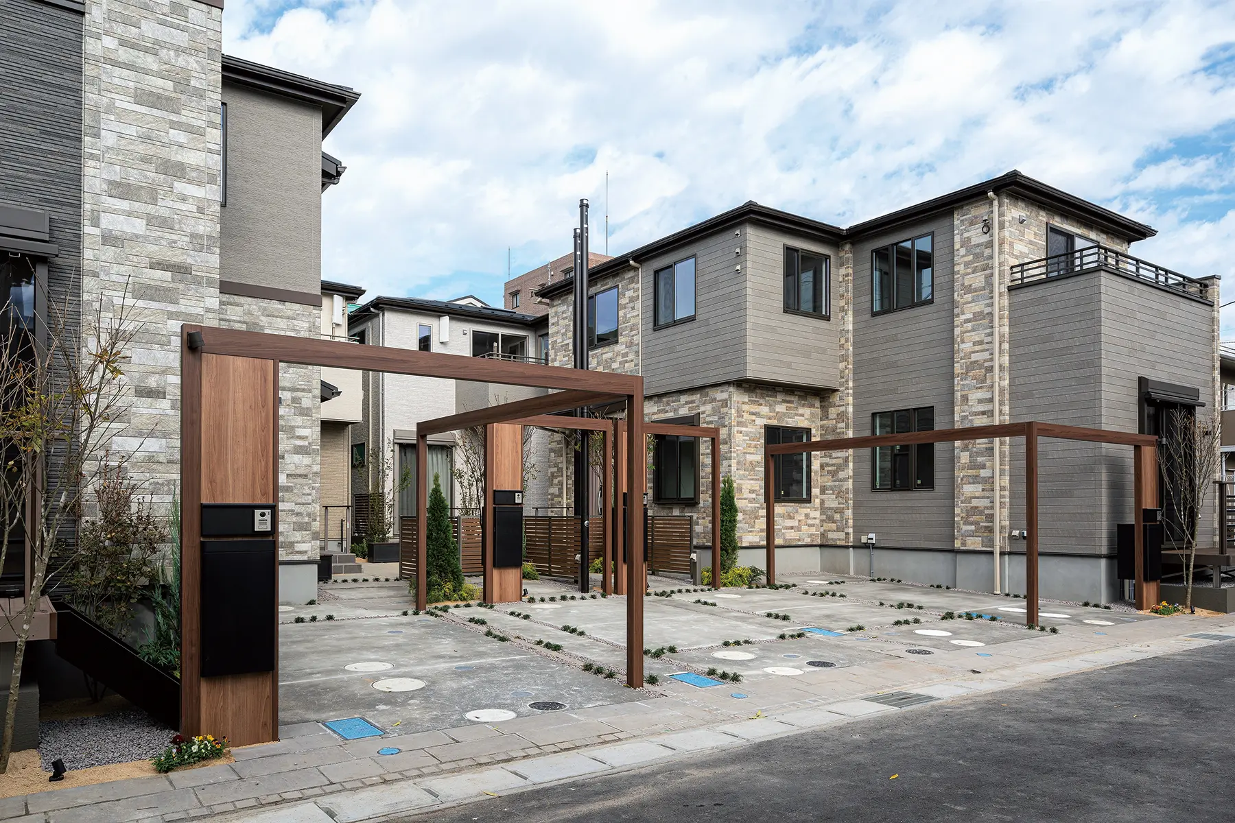 手前の2棟に格式を高める石積み柄のセコラストーン調が採用され、「共有空間」に安定感や重厚感を演出しつつ、キャスティングウッドやパルムボーダー調をアクセントとして、高級感を付与しています。後方の住宅には、細石積風の明るい意匠が用いられ、広がりと奥行き感をもたせています。
